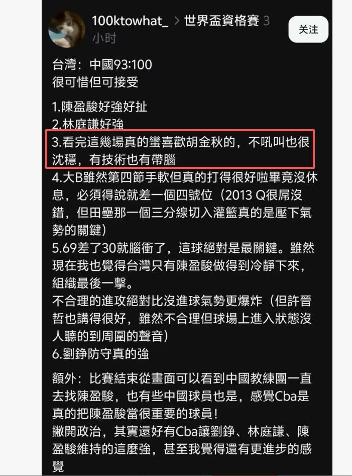 没错,让台北球迷印象最深的就是国家队的胡金秋,有台北球迷表示最喜欢胡金秋,他们说:“.看完这几场真的蛮喜欢胡金秋的,不吼叫也很沉稳,有技术也有帶脑。”实际就是赞胡金秋技术好,人品好,球商好。